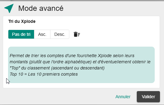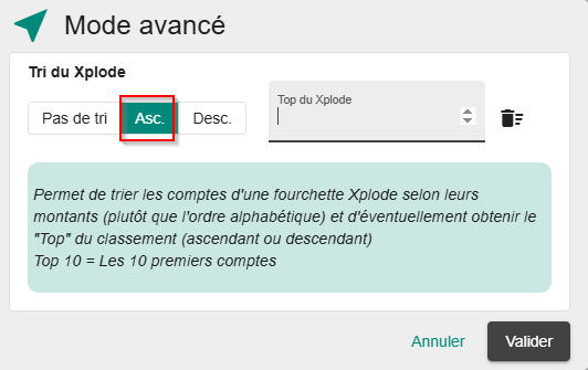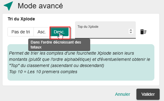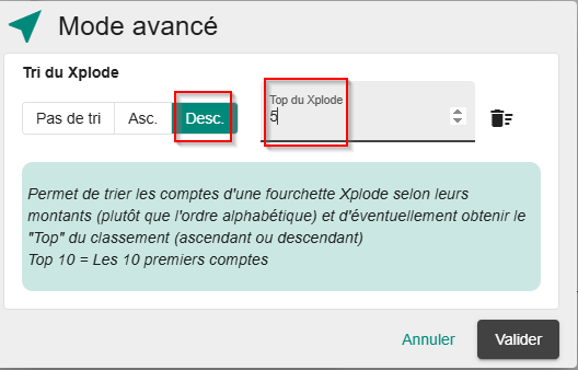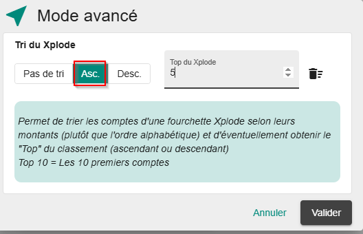 Pour afficher un combiné Top et ascendant (exemple pour afficher les 5 plus gros postes clients ou fournisseurs par exemple), cliquez sur Asc et mettez 5 dans "Top du xplode" :