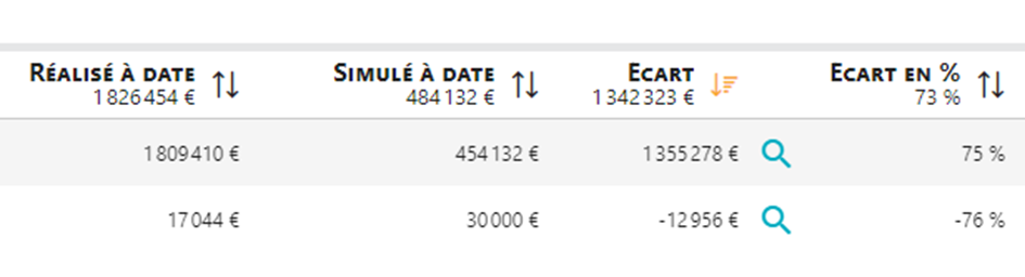 ECART (en € et en %) : Correspond aux écarts entre le réalisé comptable et la charge simulée sur la période sélectionnée