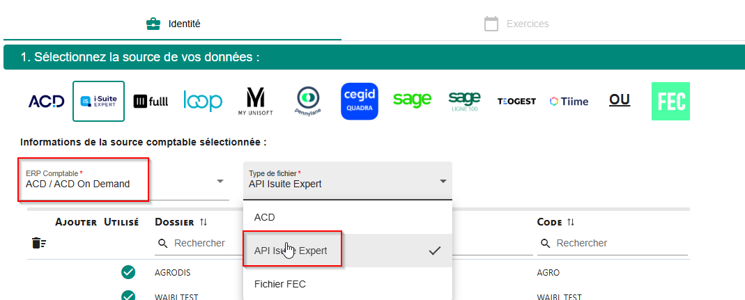 Sélectionner l’ERP ACD et le type de fichier "API Isuite Expert", ou cliquer sur l'icone Isuite Expert (l'ERP et le type de fichier se renseignera automatiquement) :