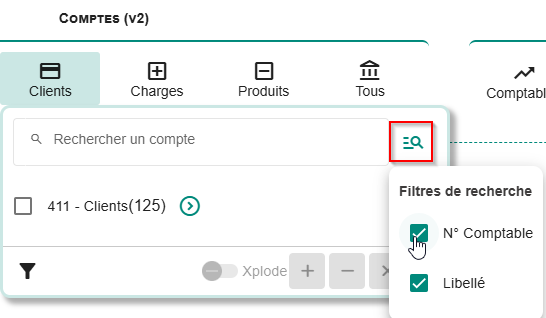 Vous pouvez rechercher par libellé (recherche par défaut) ou par compte. Pour sélectionner la recherche souhaitée, cliquer sur :