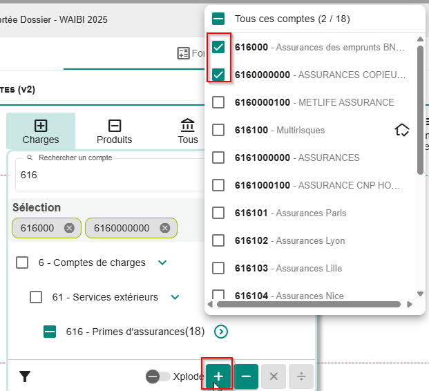 - La fourchette de compte s’affiche dans le pavé de formule. On peut alors compléter la formule avec d’autres comptes si besoin.