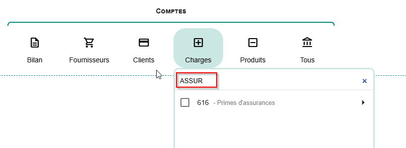 Quand on recherche par code comptable, les différents modes de recherche sont :