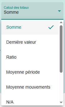 - La zone Calcul des Totaux permet d’indiquer à Waibi le mode de calcul des valeurs trimestrielles / semestrielles ou annuelles à partir des valeurs mensuelles. Les différents modes de calcul sont :