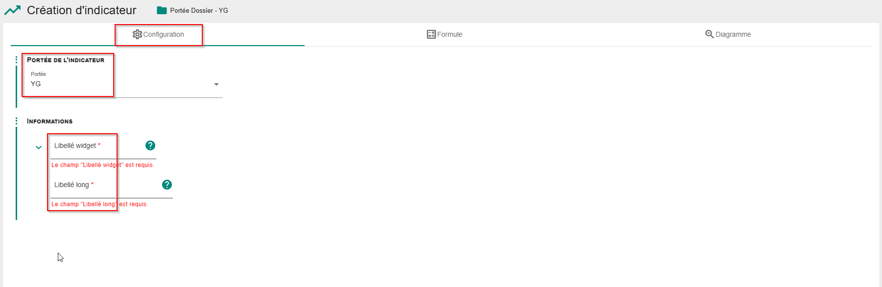 Attention : Une fois l’indicateur créé, le libellé widget n'est plus modifiable. La portée pourra être modifiée uniquement avec une portée plus large : - si l'indicateur a été créé portée dossier, vous pouvez le passer en portée groupe ou cabinet - si l'indicateur a été créé portée groupe, vous pouvez le passer en portée cabinet - si l'indicateur a été créé portée cabinet, vous ne pouvez pas modifier la portée
