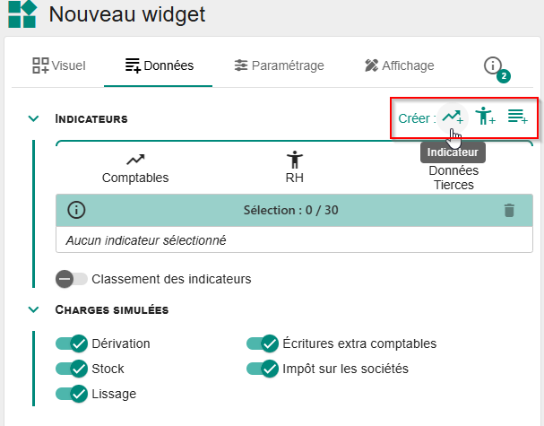 - Lors de la création d’un widget, on peut sélectionner un indicateur déjà existant ou créer un nouvel indicateur en cliquant sur :