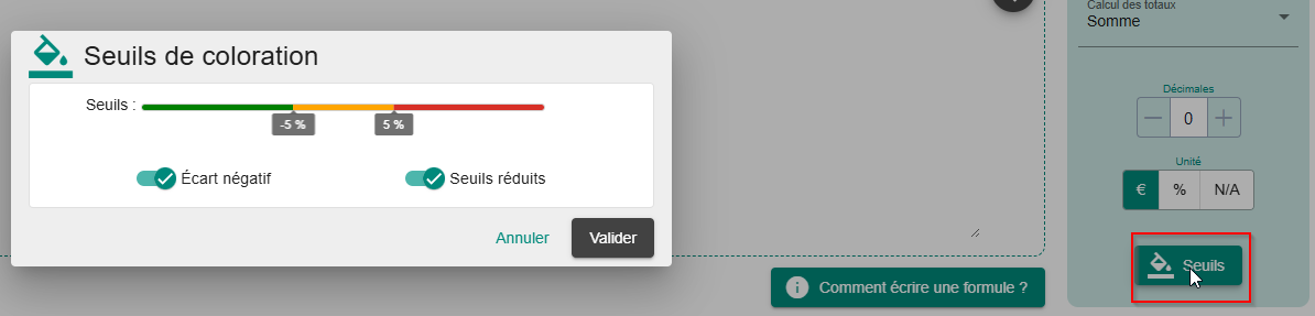 On définit ensuite la valeur des seuils permettant la coloration des jauges, en glissant les curseurs sur la ligne des seuils. Les seuils sont compris entre -20% et 20% :