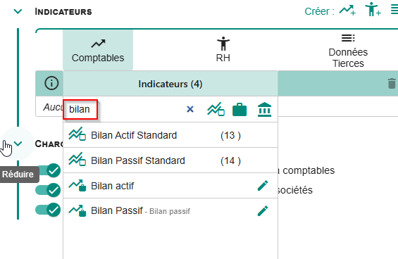 Cliquer sur l'un des 3 symboles, puis saisir le libellé de l'indicateur souhaité. Waibi propose une liste déroulante avec tous les indicateurs comprenant le même libellé. Sélectionner l'indicateur souhaité dans la liste :