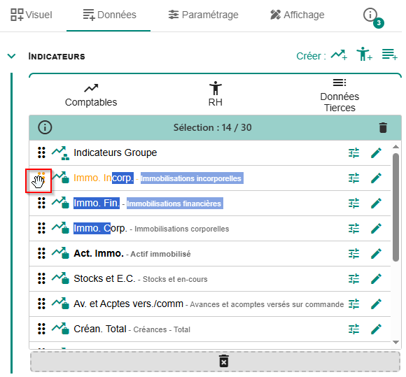 - Pour changer l’ordre d’affichage, sélectionner l'indicateur à déplacer et glisser le à l'endroit souhaité :
